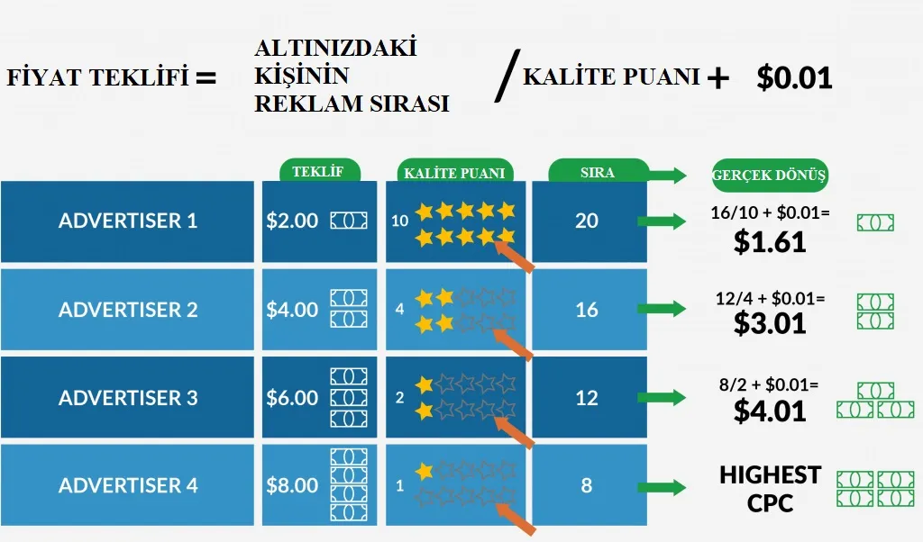 Maksimum teklif, bir tıklama için ödemek istediğinizi belirttiğiniz maksimum tutardır. Kalite Puanı, reklamınızın genel kalitesini temel alan bir ölçümdür. Google, reklamların yerleşimini belirlemek için reklam açık artırması sırasında bu metrikleri hesaplar. Bu hesaplamanın sonucu, reklam sıralaması olarak bilinir.